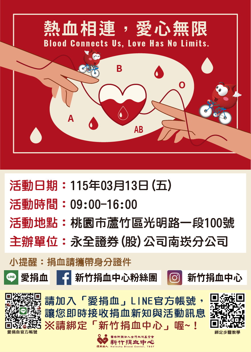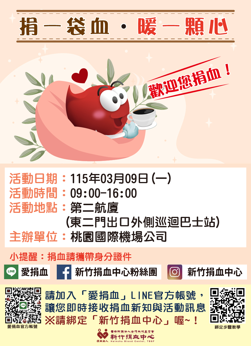 ➡活動地點:南門捐血室(桃園區三民路三段182號3樓之1)