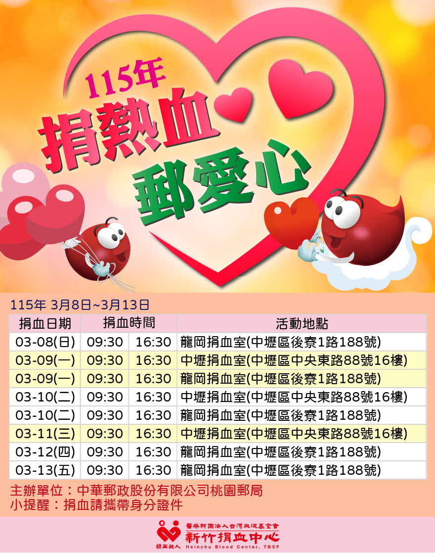 3/8(日)~3/13(五)中華郵政股份有限公司桃園郵局 愛心捐血活動!