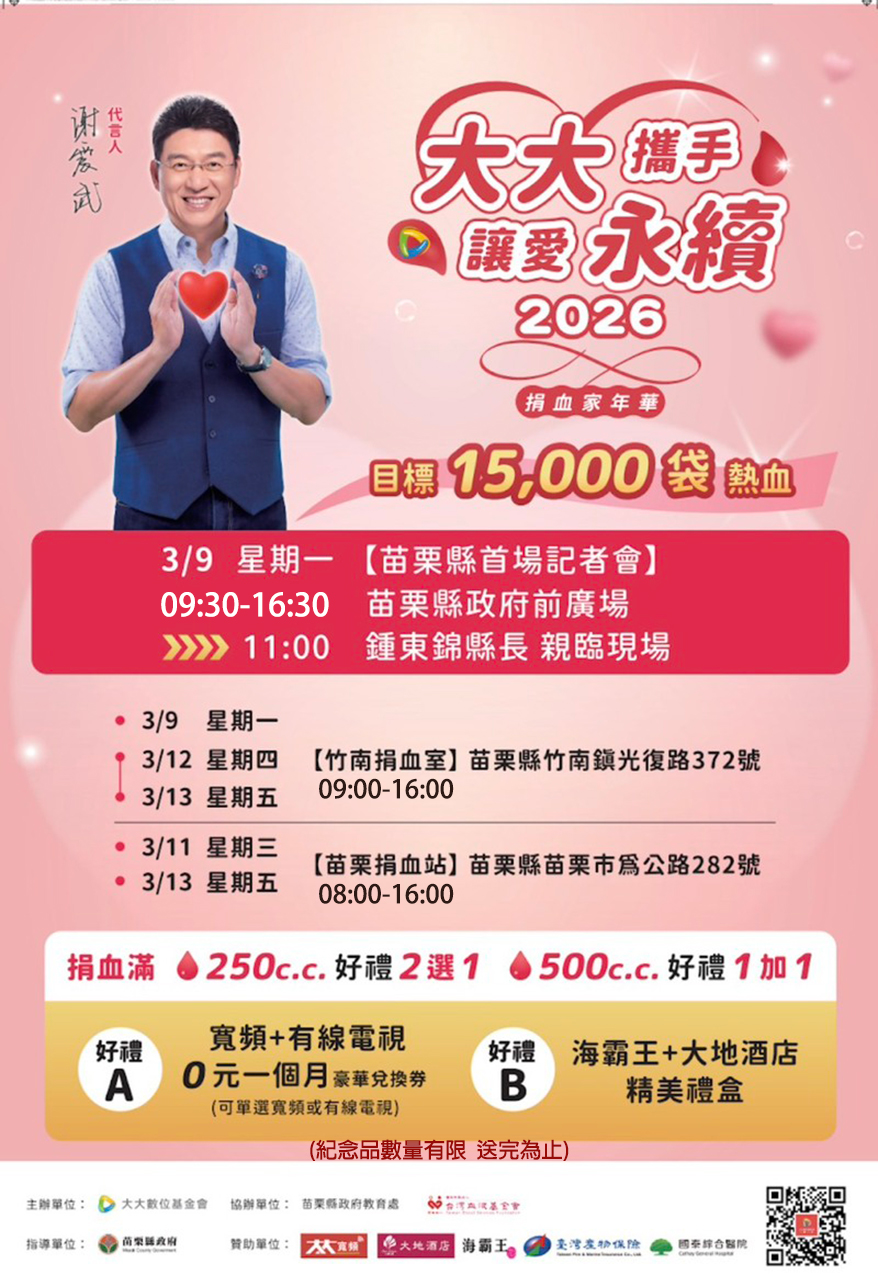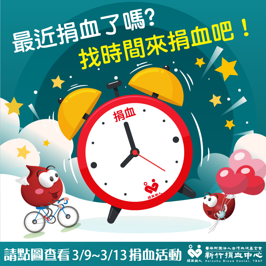 ★3/9(一)、3/12(四)~3/13(五) 09:00~16:00 竹南捐血室(苗栗縣竹南鎮光復路372號)