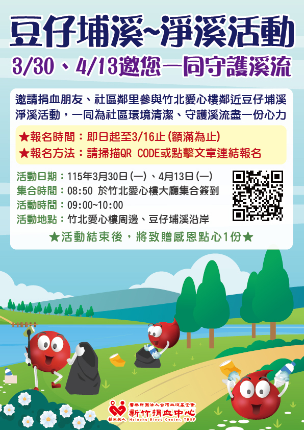 【3/30、4/13】豆仔埔溪~淨溪活動,廣邀鄰里志工共襄盛舉 2026/03/02 最新消息 【挽袖愛地球】不只捐熱血,我們更要為環境盡一份心!❤️ 除了定期捐血救人,我們居住的家園也需要大家的呵護。竹北愛心樓鄰近的「豆仔埔溪」,是陪伴我們日常的美麗溪流。今年春天,誠摯邀請各位捐血好友與社區鄰里,跟著新竹捐血中心的腳步,一起穿上舒適的鞋子,來一場城市溪流的淨化之旅! 讓我們用雙手,還給溪流最乾淨的面貌。活動結束後還有特別準備的「感恩點心」等著大家喔!🍰 活動日期: 115年3月30日(一)、4月13日(一) 集合時間: 08:50(竹北愛心樓大廳集合) 報名截止: 即日起至 3/16(額滿為止) 快點擊連結或掃描海報 QR Code,和我們一起守護溪流!🏃♂️🏃♀️ 報名連結:https://docs.google.com/forms/d/e/1FAIpQLSeP8AIy0ZPidf4FchHT87j2dID_6JC6b6FgM6KbNRzZwPPadg/viewform