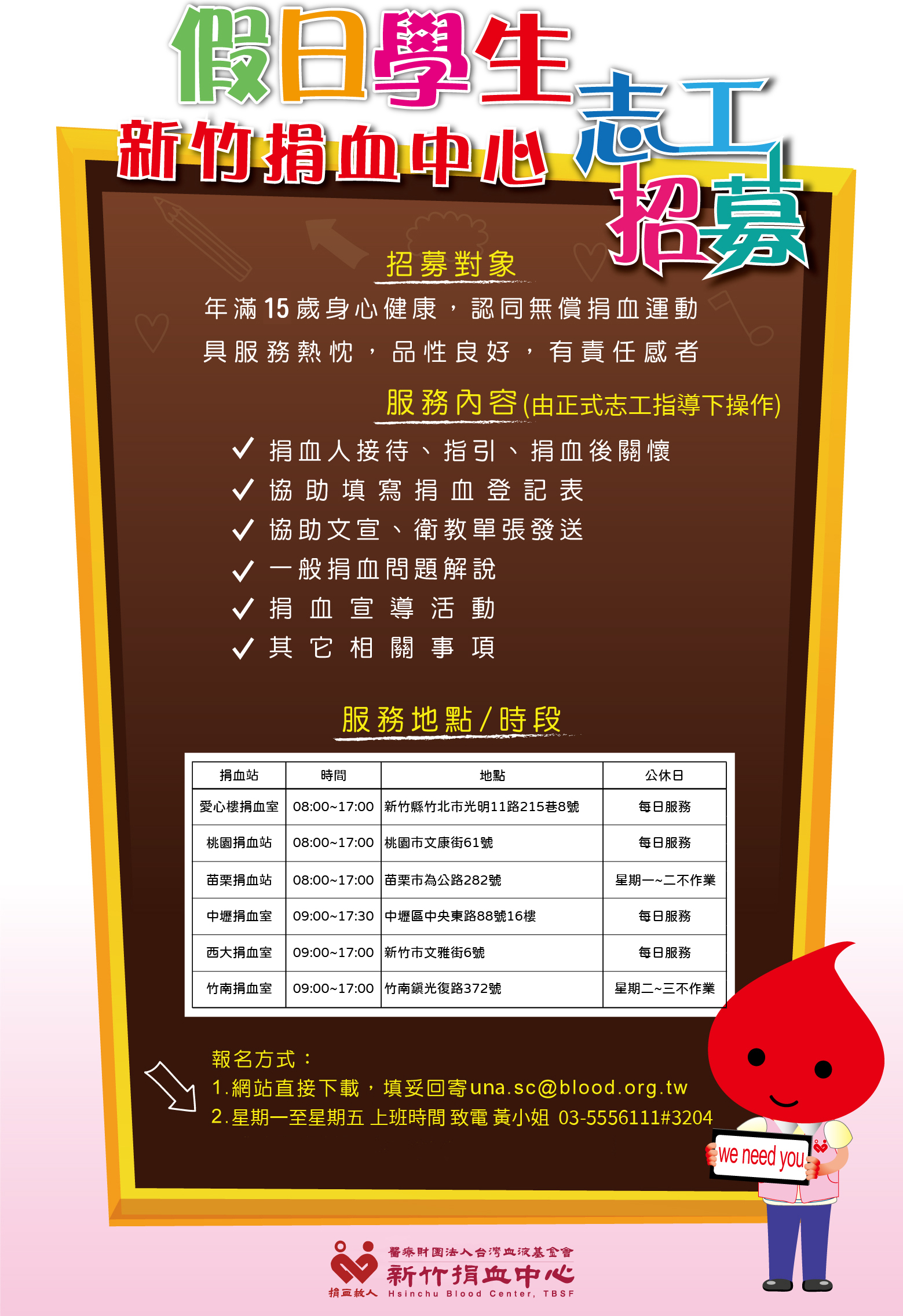 假日學生志願服務招募 2025/04/11 新竹捐血中心假日學生 ★報名表如下方附件,歡迎下載,填妥資訊回寄黃小姐,信箱:una.sc@blood.org.tw★或請於週一~週五 上班時間08:00~17:00 來電預約,黃小姐 03-5556111#3204★若家長代為預約,請協助確認學生校名全銜、班級名稱資訊,以便登記。相關檔案: 志工報名表雜湊值驗證